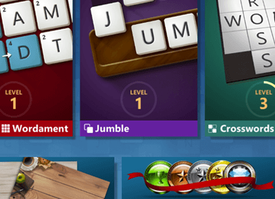 Three quality games - Crosswords, Wordament, and Jumble. Tons of levels and challenges.